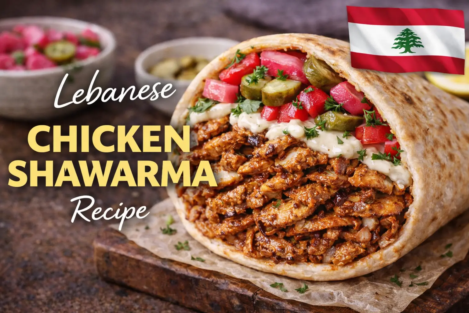 This authentic Lebanese chicken shawarma recipe features yogurt and lemon-marinated chicken thighs roasted or grilled until caramelized, thinly sliced, and wrapped in Lebanese flatbread with garlic sauce and pickled vegetables for true Beirut-style flavor.